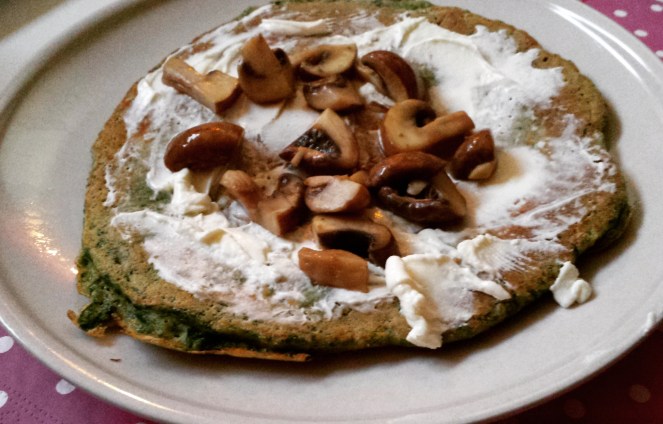 - Nun den Pfannekuchen mit Frischkäse oder Hummus bestreichen und die Pilze darauf geben