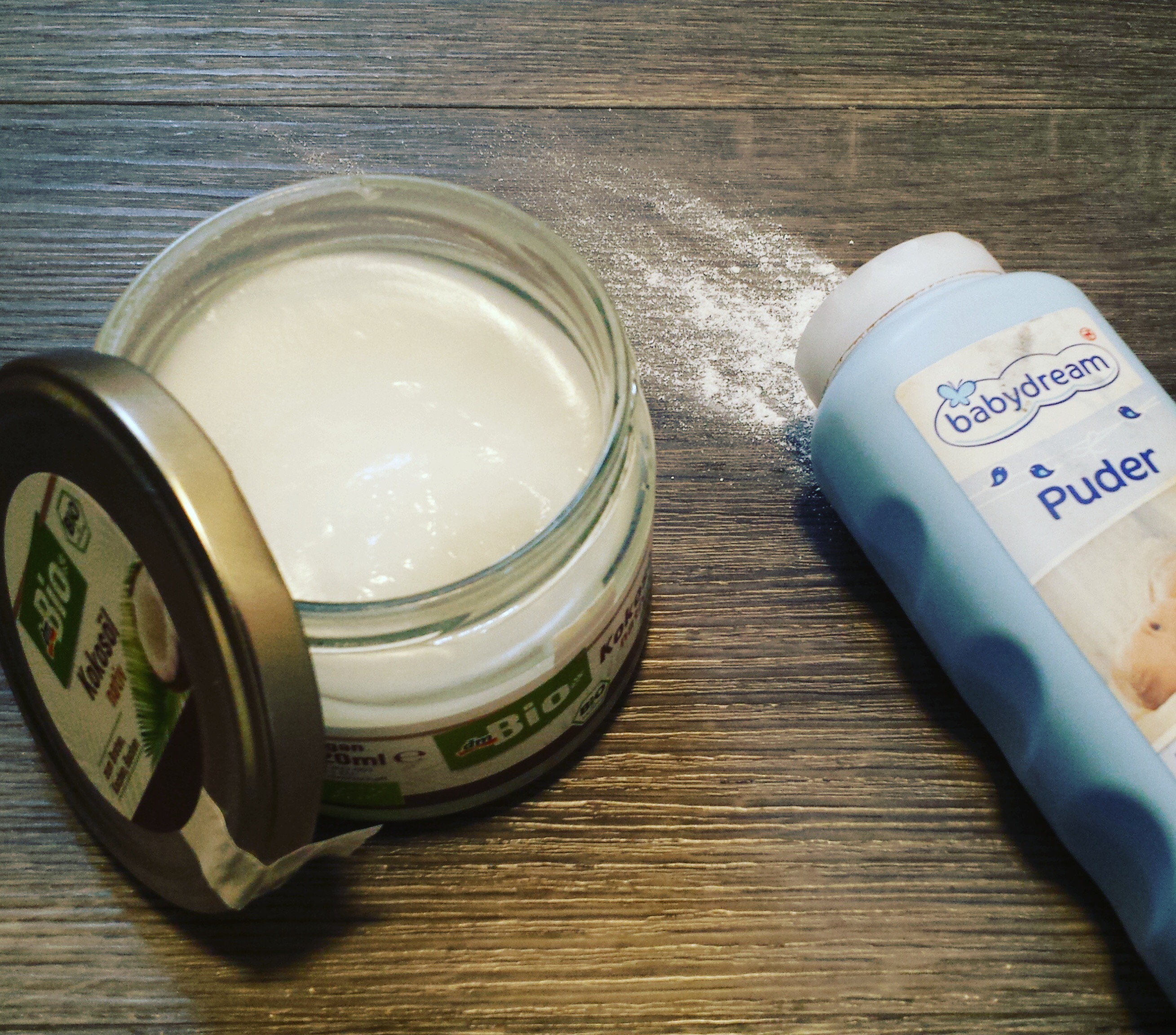 Ich nutze Babypuder zum Beispiel sehr gern zum Schminken. Statt teurem Abdeckpuder, trage ich eine Schicht Babypuder nach dem Eincremen mit einer getönten Tagescreme auf.