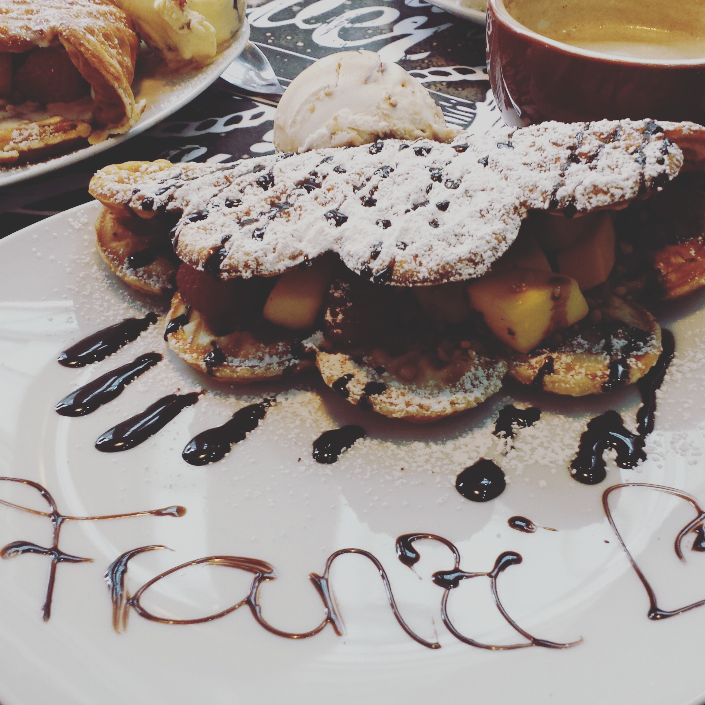 Ja, es hat mir geschmeckt und ja, es ist schon süß, seinen Namen in Schokosoße geschrieben auf dem Teller zu finden, aber: der Spaß hat fast 10 Euro gekostet! Oh Mein Gott!! Für eine stinknormale Waffel mit Früchten und Eis. Das tut weh. Und leider kann ich nur sagen, probiert es aus, wenn auch ihr das einfach mal tun müsst. Aber bitte, sucht euch danach wieder diese schönen kleinen Cafés und spendet denen euer Kaffee-Kuchen-Budget. Es ist besser aufgehoben und wir sind ja nun auch keine 15 mehr.