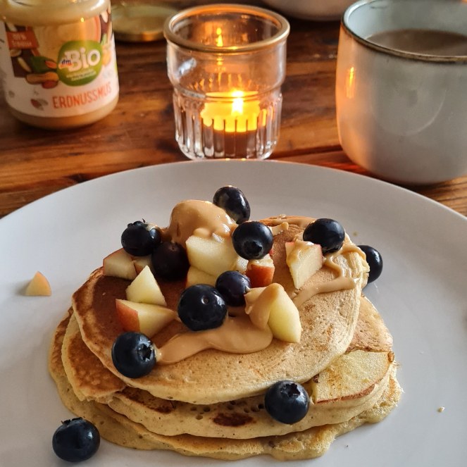 - Die entstandenen Pfannkuchen-Türmchen mit Blaubeeren & Erdnussmus dekorieren & genießen!