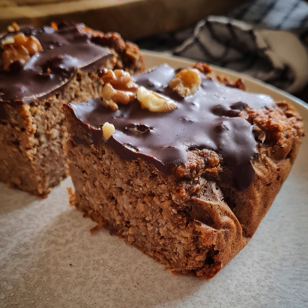 - Abkühlen lassen & nun mit dem Topping versehen. Dazu Butter und Schokolade schmelzen, mit dem Proteinshake-Pulver verrühren und gleichmäßig auf dem gebackenen Teig verteilen.