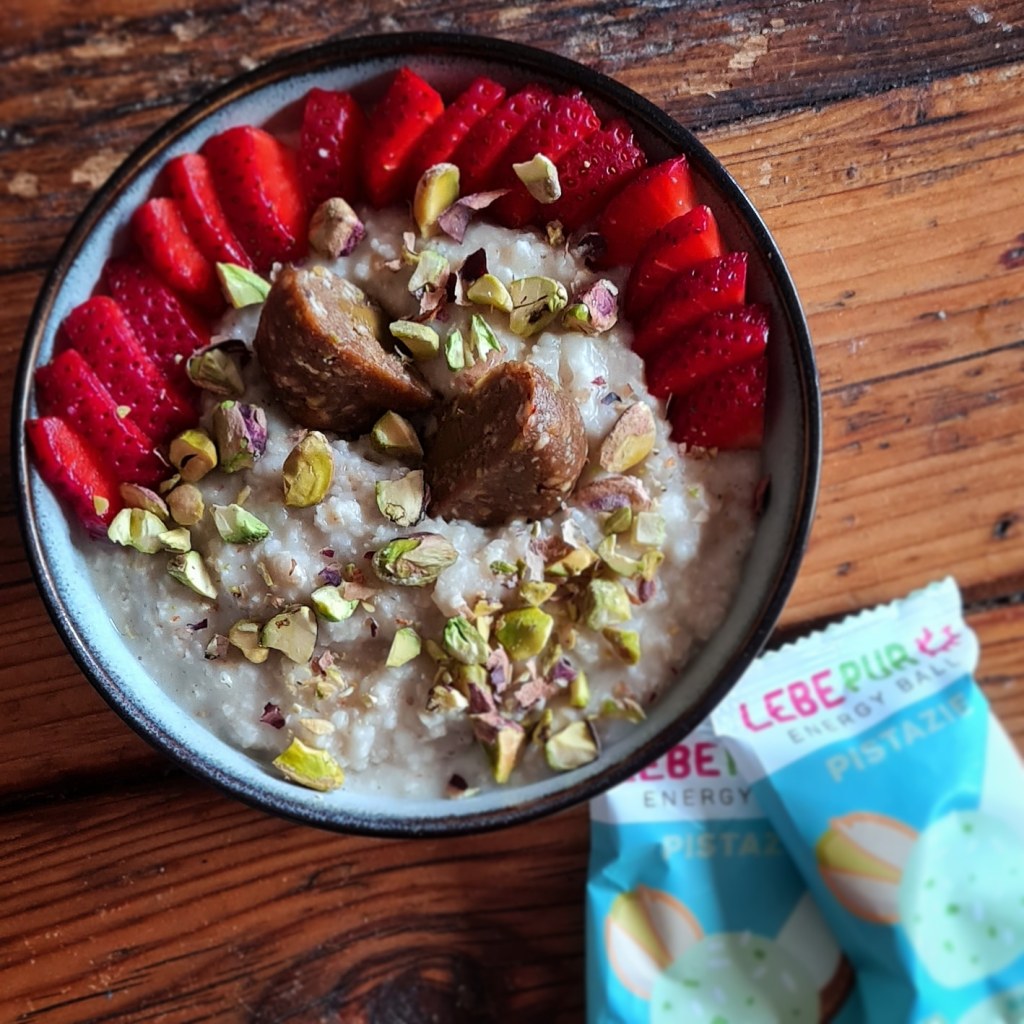 - Unterdessen Erdbeeren zurecht schneiden & auch den Energy Ball Pistazie halbieren oder vierteln.